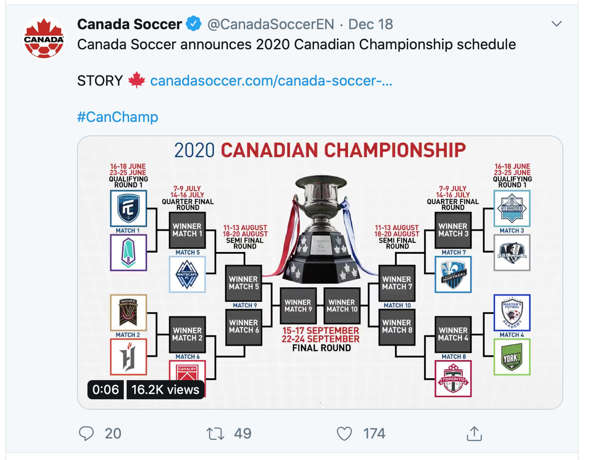 The window for Canada Soccer’s 2020 Canadian Championship will run from June to September next year.