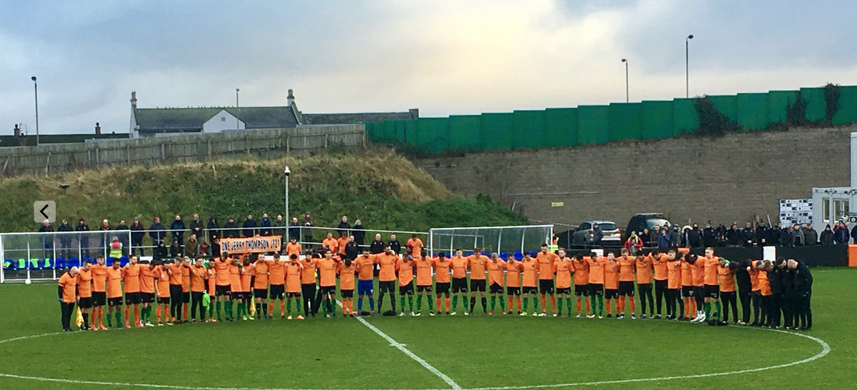 An even heavier cloud hung over the occasion than originally expected. Players from both sides emerged wearing amber Carrick Rangers shirts, with the initials JT and the number 21 on the back, and took their places in an arc around the centre-circle facing the main grandstand.