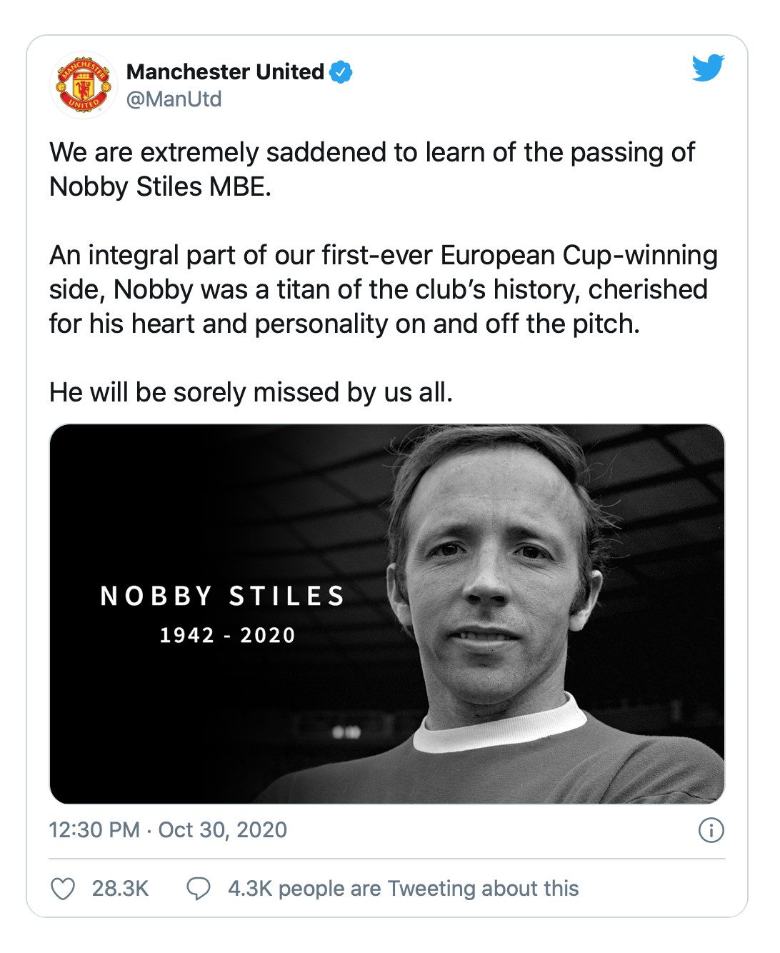 Neville today paid tribute. “Rest in Peace Nobby. Thank you for all you did for us. You taught us how to fight for everything in that red shirt.”