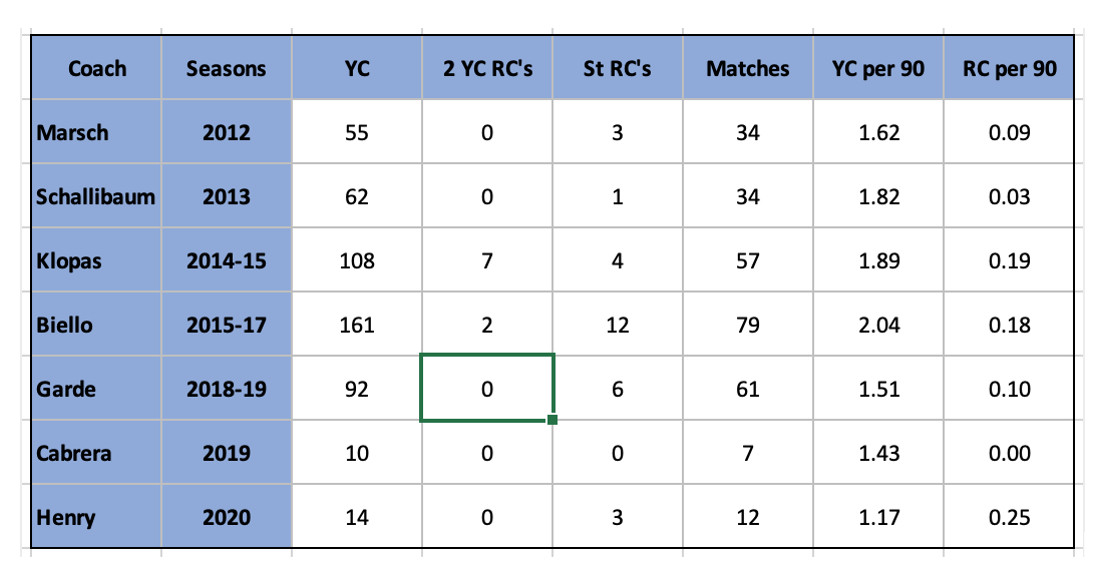 In terms of yellow cards, a similar trend emerges. No coach had a worse disciplinary record than the pair, Schallibaum coming closest to Klopas, but Marsch, Garde, Cabrera and Henry all managed to keep discipline in check much better. Even now, despite the recent rash of reds, Henry’s team has incurred relatively few yellow cards.