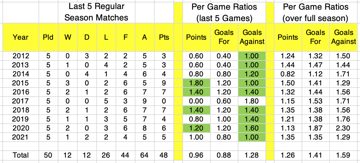 But from 2017 on, it’s been a case of reverting to type. In 25 ‘last-five’ regular season games since, only 6 wins have arrived. There have been 15 defeats. Never mind championship or play-off form, this is not even mid-table form!